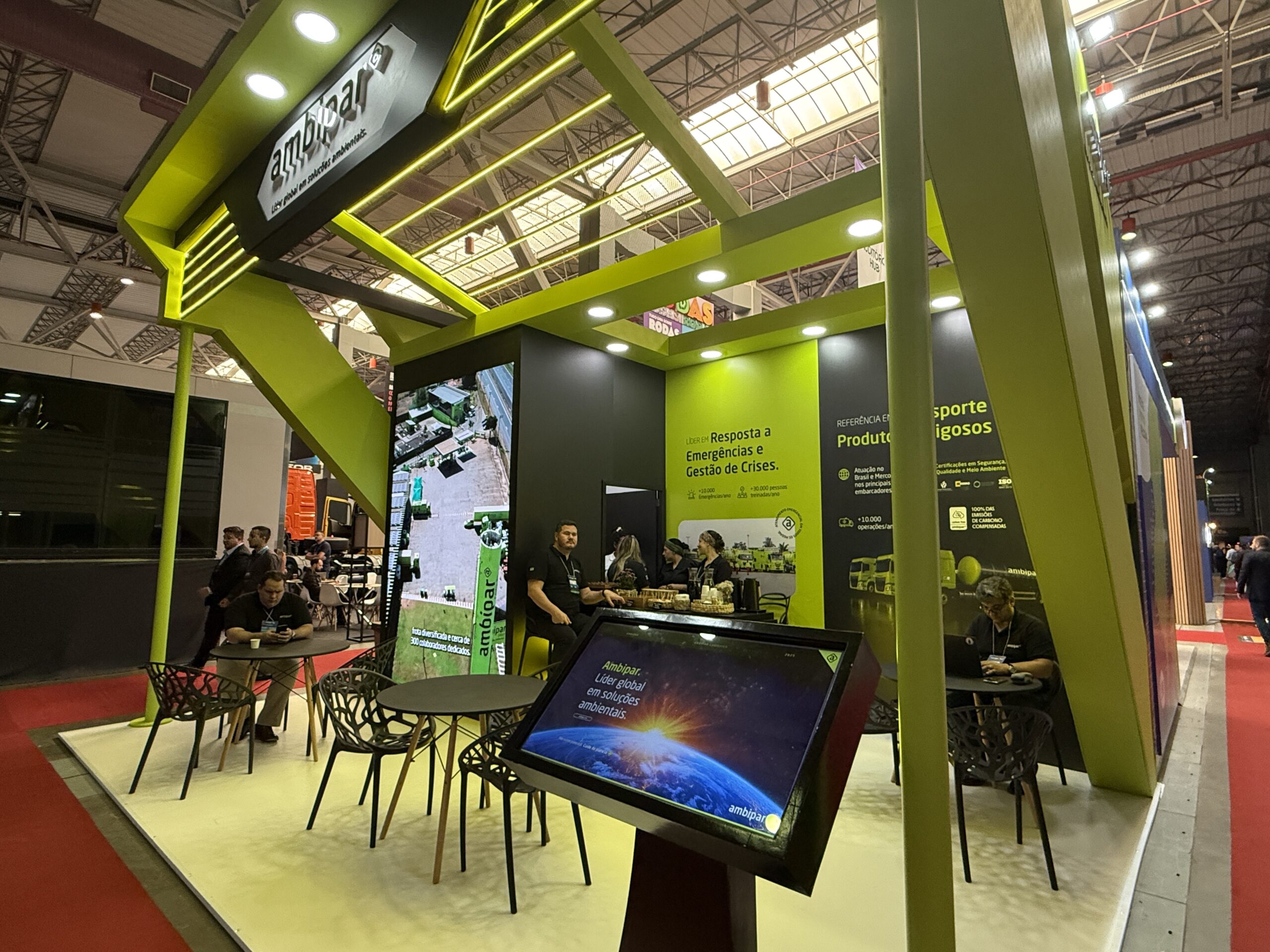 A Ambipar apresentou soluções logísticas voltadas à descarbonização do transporte rodoviário, incluindo caminhões que operam com biocombustível Be8 em motores a diesel padrão — sem necessidade de adaptações mecânicas —, além de modelos movidos a hidrogênio e veículos preparados para rodar 100% com biodiesel B100, capazes de reduzir em até 77% as emissões. A empresa também lançou a primeira carreta sustentável do Brasil, equipada com painéis solares e energia limpa, reforçando seu papel de pioneirismo ambiental no setor.